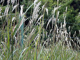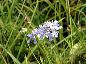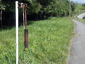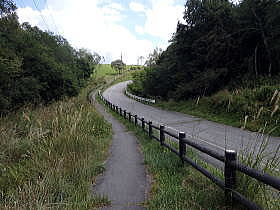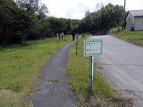 すぐに舗装農道の脇に遊歩道が並走するようになり、大きな農機具などの車両置き場を過ぎ、鋭角なヘアピンカーブで小沢を越えていく。マツムシソウなどが咲くと同時にカーンカーンと鳴らす熊除けの鉄管なども数ヶ所にある。