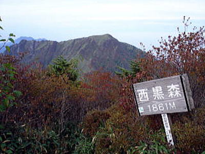その20mを登って稜線に出、西黒森に向かった。稜線を緩く辿ると山頂直下の南側をトラバースする道になり、小さな標識が西黒森の分岐を示していた。ここからは標高差はわずか40〜50mでしかないが、急峻な笹の斜面であり、笹を掴みながら急登すると、山頂南東の尾根の大岩付近に出た。